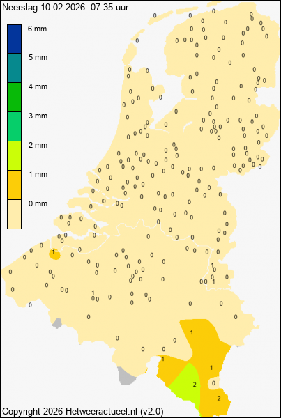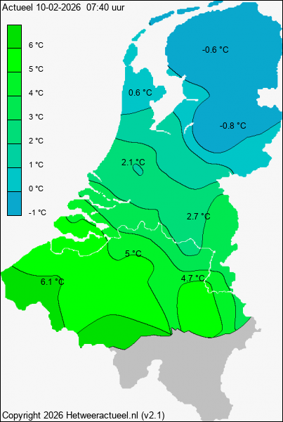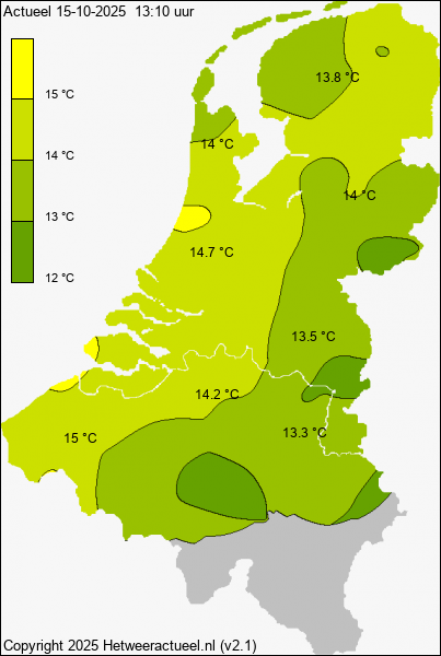 Het kaartje met de actuele temperatuur wordt iedere 10 minuten opgebouwd uit de actuele gegevens van alle weerstations, mits de data minder dan 1 uur oud is.
