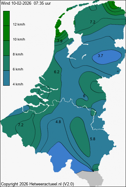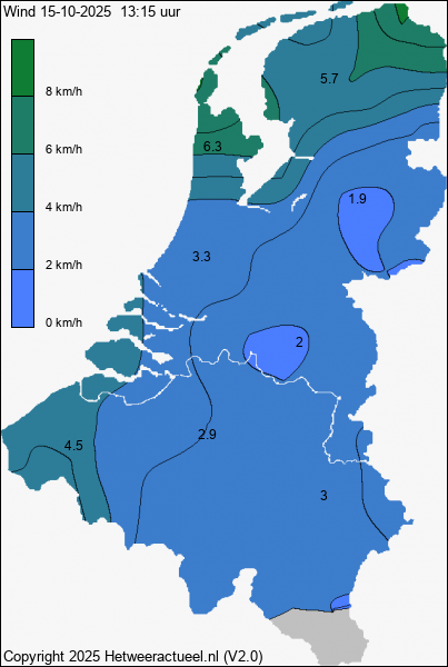 Het kaartje met de actuele wind windsneldheid (10 minuten gemiddelde) wordt 2 keer per uur opgebouwd uit de actuele gegevens van alle weerstations, mits de data minder dan 1 uur oud is.